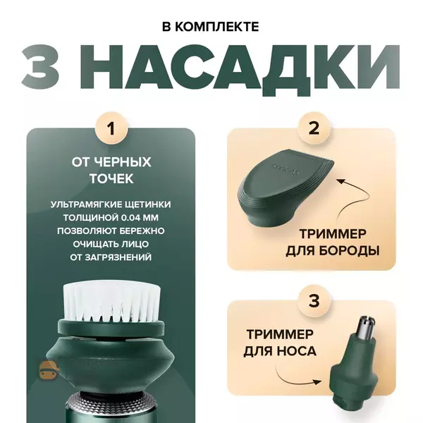 Насадки: для сухого бритья, бритва, триммер для носа, массажная щетка для лица
